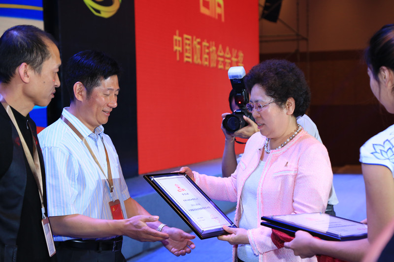 中國(guó)飯店協(xié)會(huì)會(huì)長(zhǎng)韓明女士給獲獎(jiǎng)嘉賓頒獎(jiǎng)