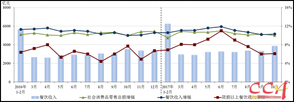 11月14日國(guó)家統(tǒng)計(jì)局最新發(fā)布數(shù)據(jù),2017年10月,全國(guó)餐飲收入3852億元,同比增長(zhǎng)10.3%;限額以上單位餐飲收入906億元,同比增長(zhǎng)6.1%。2017年1-10月,全國(guó)餐飲收入32279億元,同比增長(zhǎng)10.9%;限額以上單位餐飲收入7932億元,同比增長(zhǎng)7.8%。