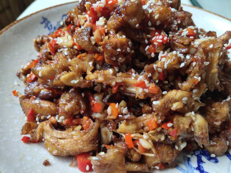 手撕雞炒制的非常入味,肉質細膩且富有彈性,肥瘦剛剛好,一口咬下去油花滋飛,剛碰到牙齒,滿嘴都是雞肉的香味,微微嗆喉的辣椒給味蕾帶來了另一番滋味,一切都恰到好處。熱辣的醬汁淌過舌頭直達喉嚨,勁道十足的雞肉在舌尖也留有余香,就連骨頭嚼起來也很有滋味。