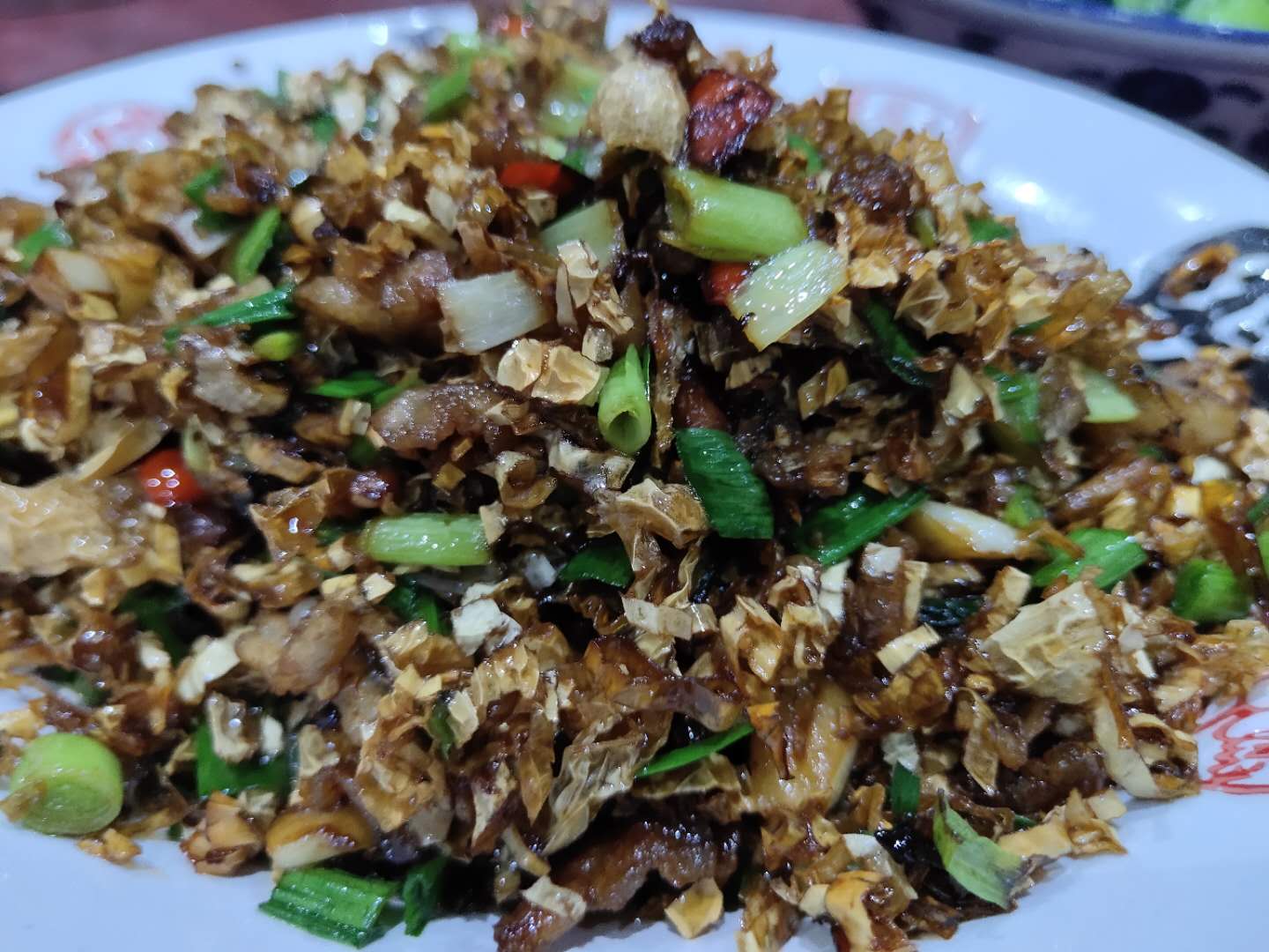 簡單的原材料卻碰撞出令人驚喜的味道。大火干煸后的肉帶著一絲焦酥,內里松軟可口,味辣而不干,拌炒后的白椒浸透入味,三分辣五分油還有兩分香,豬肉與白椒互相入味滲透,肉味中染上白椒的蔬香,而白椒更是吸足了豬肉的油香,拌米飯而食,更是絕味。