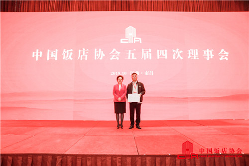 韓明會長為中國飯店協(xié)會資深副會長戴寧頒發(fā)證書